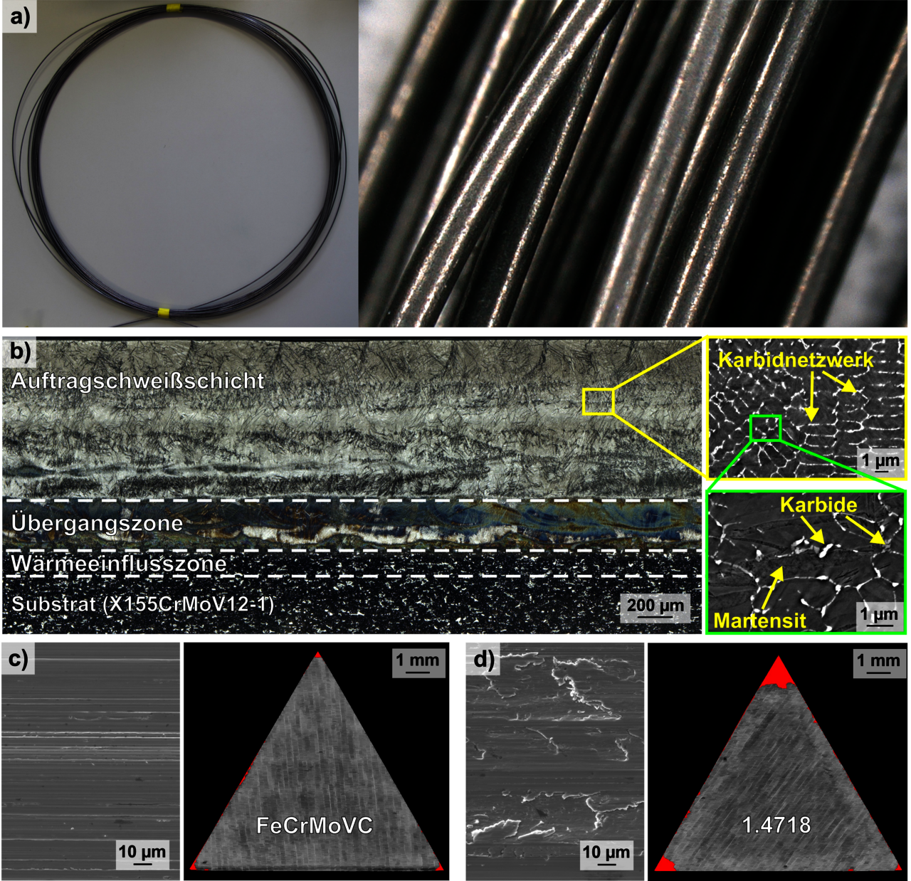 Durch die hohen Abkühlraten während des Auftragschweißprozesses und der Nutzung geeigneter Laserparameter, können festhaftende und rissfreie Beschichtungen auf den kohlenstoffreichen Stahloberflächen erzeugt werden. Die Schichten weisen ein Gefüge auf bestehend aus Martensit, Austenit sowie einem feingliedrigen Netzwerk aus MC- und M2C-Karbiden und zeigen, im Vergleich zu den untersuchten Substratwerkstoffen sowie konventionell eingesetzten Schweißzusatzwerkstoffen, hohe Härten (bis ca. 900 HV 0,1) und eine verbesserte abrasive Verschleißbeständigkeit.