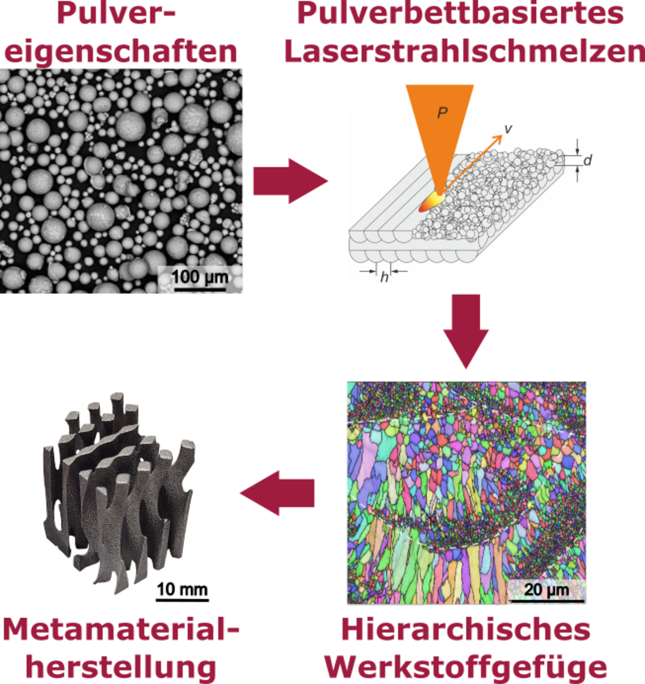 Des Weiteren werden seltenerdfreie Al-Mg-Zr-basierte Legierungen zur Herstellung widerstandsfähiger und schadenstoleranter Strukturen mittels PBF-LB/M entwickelt. Das Legierungsdesign wird durch neue datenbasierte und experimentelle Methoden unterstützt, um die Materialentwicklung zu beschleunigen. Begleitet wird dies durch skalenübergreifende Charakterisierungen, um den Einfluss des Gefüges auf die mechanischen Eigenschaften zu analysieren. Das so entwickelte Al-Mg-Zr-Si-Legierungssystem kann u.a. genutzt werden, um resiliente Strukturen, wie künstlich entworfene mechanische Metamaterialien, herzustellen (siehe Abbildung 2).