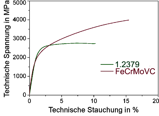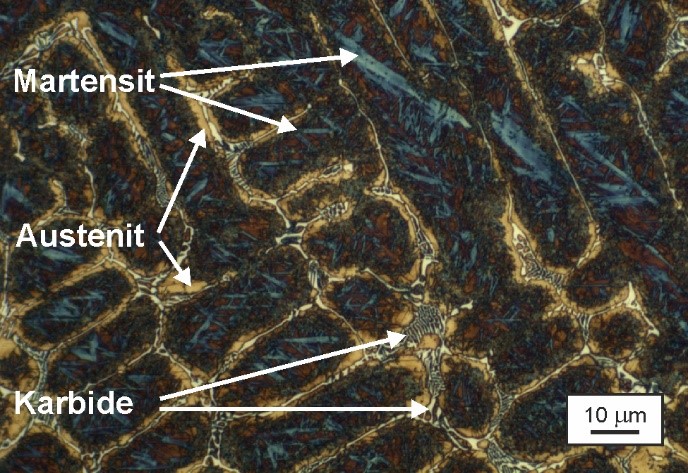 Einen wesentlichen Ansatz unserer Forschung liegt in der gezielten Einstellung von Phasen durch Steuerung der Erstarrungs- bzw. Abkühlraten. Durch die Einstellung hoher Abkühlraten kann die Bildung der Nichtgleichgewichtsphasen Martensit, Restaustenit sowie komplexer Karbide gefördert werden. Diese Kombination von Phasen führt bei der entwickelten Fe85Cr4Mo8V2C1-Legierung (Massenanteil in %) bereits im Gusszustand zu einer hohen Härte (≈ 60 HRC), Stauchgrenze (≈ 2000 MPa) und Druckfestigkeit (≈ 4000 MPa) sowie einer hohen Bruchstauchung von 12%. Gleichzeitig können durch eine maßgeschneiderte Phasenzusammensetzung und ein entsprechendes Karbiddesign exzellente abrasive Verschleißeigenschaften bei den entwickelten Legierungen erzielt werden.