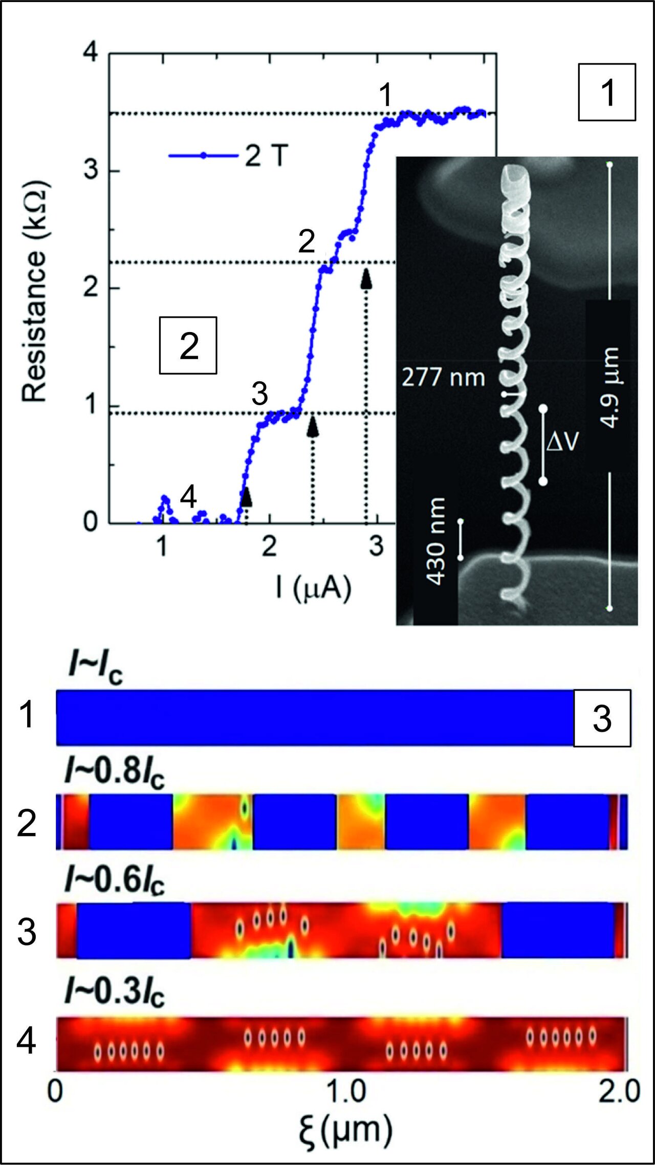 Novel schemes based on the design of complex three-dimensional (3D) nanoscale architectures are required for the development of the next generation of advanced electronic components. He+ focused-ion-beam (FIB) microscopy in combination with a precursor gas allows one to fabricate 3D nanostructures with an extreme resolution and a considerably higher aspect ratio than FIB-based methods, such as Ga+ FIB-induced deposition, or other additive manufacturing technologies. In this work, we report the fabrication of 3D tungsten carbide nanohelices with on-demand geometries via controlling key deposition parameters. Our results show the smallest and highest-densely packed nanohelix ever fabricated so far, with dimensions of 100 nm in diameter and aspect ratio up to 65. These nanohelices become superconducting at 7 K and show a large critical magnetic field and critical current density. In addition, given its helical 3D geometry, fingerprints of vortex and phase-slip patterns are experimentally identified and supported by numerical simulations based on the time-dependent Ginzburg–Landau equation. These results can be understood by the helical geometry that induces specific superconducting properties and paves the way for future electronic components, such as sensors, energy storage elements, and nanoantennas, based on 3D compact nanosuperconductors.
