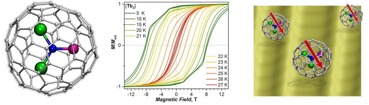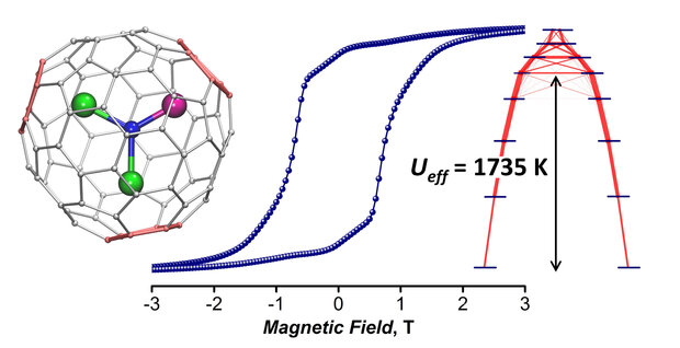 Lanthanide-based EMFs provide a convenient possibility to stabilize metal atoms in unconventional clusters inside the carbon cage. In clusterfullerenes, such as Dy2ScN@C80 shown in the Figure, endohedral lantanide ions are coordinated to negatively charged non-metal ions, such as N3−, S2−, O2−, etc. The presence of such ions at a close distance to lanthanides creates strong axial ligand field and hence large magnetic anisotropy. Thus, many Dy-EMFs exhibit slow relaxation of magnetization at helium temperatures. For Dy2ScN@C80, the barrier of the reversal of magnetization is 1735 K, which is one of the highest values among all SMMs. Relaxation of magnetization in this SMM follows the Orbach mechanism and proceeds via the 5th excited Kramers doublet.