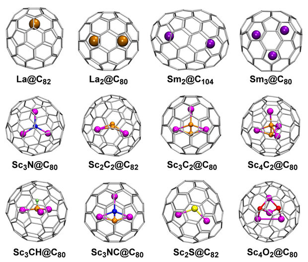 Closed carbon cages encapsulating different atoms, ions, clusters and even small molecules are known as "endohedral fullerenes" (from Greek ἔνδον – within and ἕδρα – face of a geometrical figure). Endohedral metallofullerenes (EMFs) are thus fullerenes with one or more metal atoms inside the carbon cage. In the chemical formulae, endohedral species are written first followed by the symbol “@” and then by the fullerene (e.g., "Sc3N@C80" denotes the fullerene C80 with endohedral cluster Sc3N). The Figure shows different types of EMFs, from mono- and di-metallofullerenes to complex clusterfullerenes comprising up to four metal atoms and one-two non-metals (C, N, O, S, etc). Encapsulations of Lanthanide ions within the fullerene cage may lead to fullerene-based single molecule magnets.