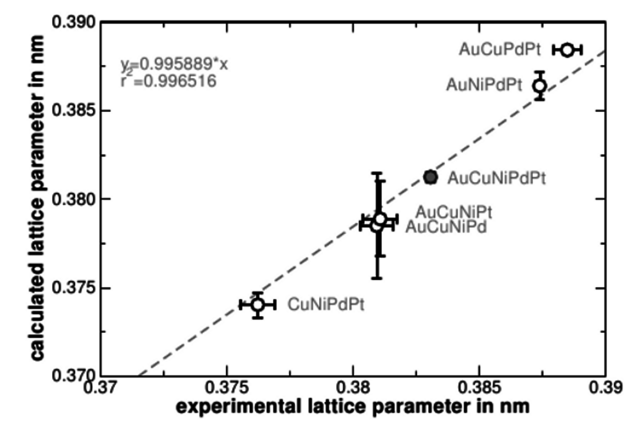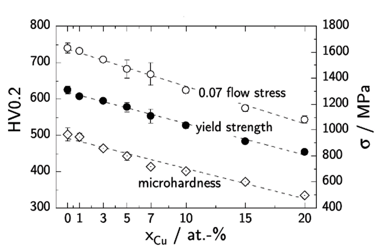 The compositional dependence of the yield strength σ y has been studied for a series of polycrystalline (AuNiPdPt )1−x Cux alloys by means of compression tests. σ y is found to decrease linearly with increasing Cu concentration. This behaviour is in contradiction to the generalised theory for solid solution strengthening in concentrated solid solutions provided by Varvenne et al. [1]. A breakdown of the scaling behaviour is found as σ y should be non-linear and slightly increasing when modifying the composition from AuNiPdPt to AuCuNiPdPt.