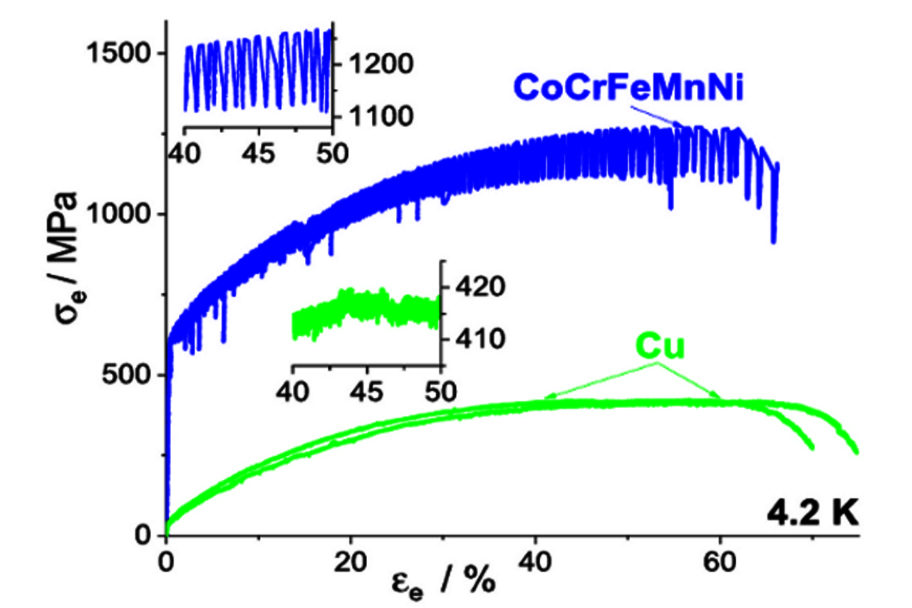 The current work compares the deformation behavior of CoCrFeMnNi and CoCrNi in the temperature interval between 295 K and 8 K through a series of quasi-static tensile tests. Temperature-dependent yield stress variation was found to be similarly high in these two alloys. Previous investigations only extended down to 77 K and showed that a small amount of ε-martensite was formed in CoCrNi while this phase was not observed in CoCrFeMnNi. The present study extends these investigations down to 8 K where similar low levels of ε-martensite were presently detected. Based on this result, a rough assessment has been made estimating the importance of deformation twinning to the strength. The relative work hardening rates of CoCrFeMnNi and CoCrNi were comparable in value despite the differences in ε-martensite formation during deformation. CoCrFeMnNi deforms by dislocation slip and deformation twinning while deformation in CoCrNi is also accommodated by the for mation of ε-martensite at cryogenic temperatures. Additionally, CoNi, a solid solution from the Co–Cr–Fe–Mn–Ni system with low strength, was used for comparison, showing contrasting deformation behavior at cryogenic temperatures.