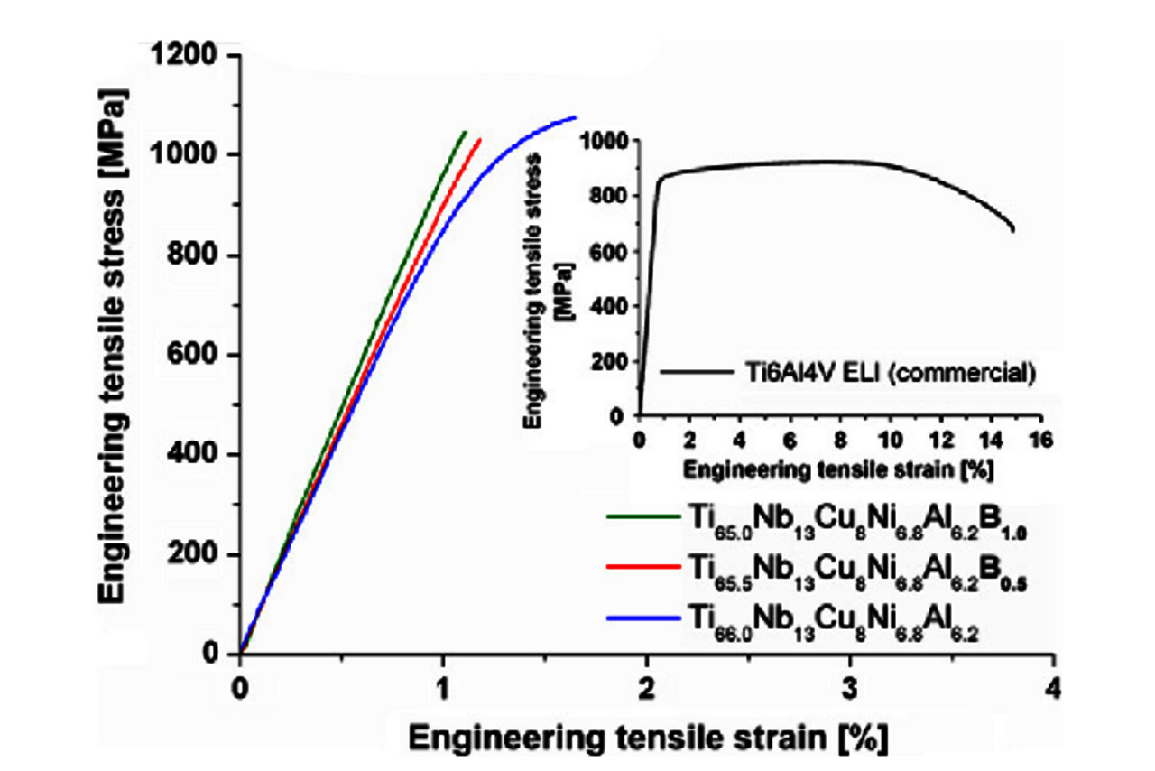 The influence of boron additions and different oxygen contamination levels on the microstructure and the mechanical properties in the Ti66ÀxNb13Cu8Ni6.8Al6.2Bx (0 6 x 6 1) system were investigated. The alloys were prepared by levitation copper mould casting as rods with a diameter of 5 mm using different grades of starting elements. The alloy without boron exhibits a maximum compressive stress of more than 2500 MPa, associated with a compressive strain of more than 30%. The ultimate tensile stress is $1075 MPa with a maximum elongation of 1.6%. Increased oxygen content leads to a rise of yield strength due to solid solution hardening. Boron additions promote grain refinement and reinforce the interdendritic phase compound by forming needle-like TiB precipitates. This change in microstructure increases the yield stress and the Young’s modulus and lowers the plastic strain. The microstructure was analysed in terms of the boron content by means of scanning electron microscopy, Auger electron spectroscopy and transmission electron microscopy. The presented mechanical properties are compared with the compression and tensile properties of the commercially available Ti6Al4V ELI (ELI = extra low interstitial) alloy.