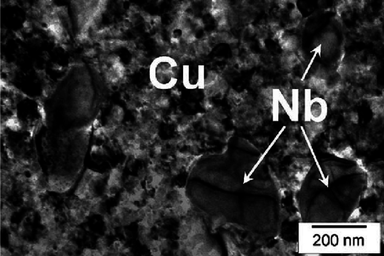 Alloys with both high strength and high conductivity have been produced by mechanical alloying. In the present study, copper was mechanically alloyed with 5, 10 and 20 at.% Nb using a planetary ball mill. The Cu–Nb phase diagram shows a negligibly low mutual solubility in the solid state, but high energy ball milling can largely extend the region of solid state solution. Previously, it was observed that niobium partly dissolves in the copper lattice during milling. The present investigation demonstrates that this limit can be extended to a strongly supersaturated Cu solid solution of up to 10 at.% Nb provided the appropriate mechanical alloying method is applied. The change in the powder microstructure was followed by scanning and transmission electron microscopy (TEM) as well as by X-ray diffraction (XRD) analysis. In the case of Cu–5%Nb and Cu–10%Nb a homogeneous single-phase microstructure was obtained after 30 h of milling. Elemental Nb could no more be detected, indicating the formation of a metastable supersaturated Cu–Nb solid solution.