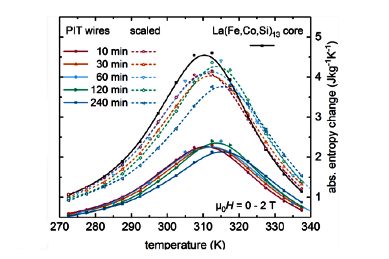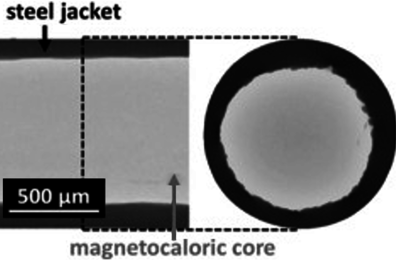 Data of the pulsed magnetic-field measurements on the Gd-filled PIT-wires and a Gd–core separated from the jacket are presented, with an achievable temperature change of 1.2 K for the wire and 5.2 K for the Gd in 2 T, respectively. A comparison to previously studied La(Fe, Co, Si)13-filled composite wires is included. It indicates that performance losses due to the passive matrix material cannot be overcome only by an increased adiabatic temperature change of the core material, but instead the wire components need to be chosen regarding an optimized heat capacity ratio, as well.
