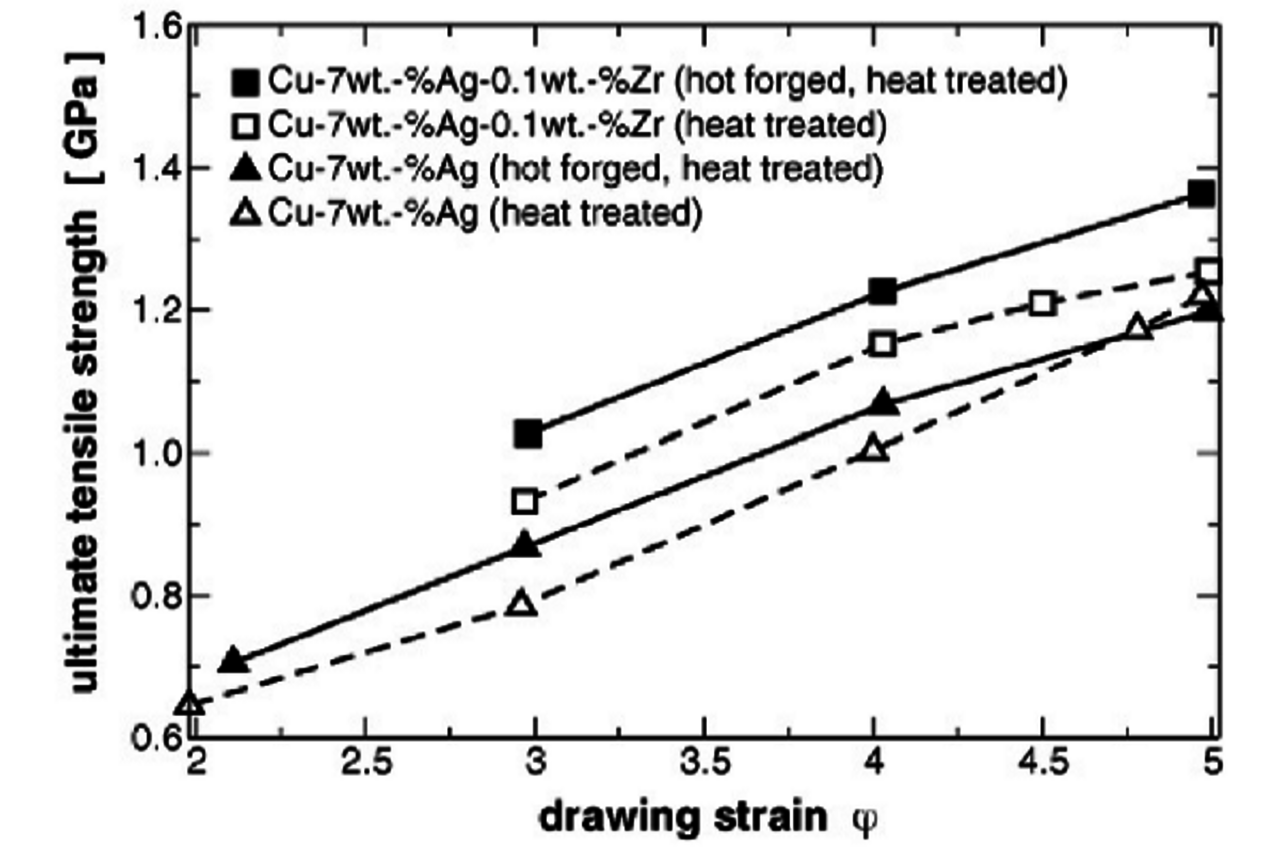 Adding up to 0.05 wt.%Zr to Cu–7 wt.%Ag alloys suppresses the discontinuous precipitation mode in these alloys. As a consequence, the continuous precipitation mode, which is also commonly observed in these alloys, is enhanced. The addition of Zr in the mentioned range guarantees a minimum of secondary phases that contain Zr. The subjection of Cu–7 wt.%Ag–0.05 wt.%Zr alloys to a certain deformation strain followed by an intermediate heat treatment gives rise to a logarithmic drawing strain of up to φ = 5.82 in these alloys. In this cold worked condition, an ultimate tensile strength of 1.4 GPa and a strain to failure of 1.6% are observed. Furthermore, an electrical conductivity of 60%IACS (IACS, International Annealed Copper Standard, i.e. the conductivity of copper) is measured. The influence of the Zr content, the thermal treatments, and the deformation process on the microstructure and thereby on the mechanical and electrical properties is discussed.
