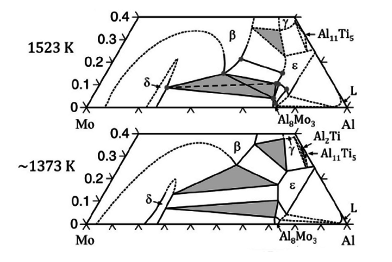 Titanium aluminides based on the ternary AleMoeTi system are promising candidates for the devel-opment of high-temperature materials. Close to the binary AleMo system, the stability of a ternary t phase was reported in a previous work. To investigate the relationship of this ternary phase with the binary high-temperature phase Al63Mo37 and to re-evaluate the heterogeneous reactions of Al63(Mo,Ti)37 a number of alloys were prepared and annealed at 1573, 1673 and 1773 K, respectively. The heat-treated alloys were analyzed by means of scanning electron microscopy (SEM), X-ray diffraction (XRD), electron-probe microanalysis (EPMA) and differential thermal analysis/differential scanning calorimetry (DTA/DSC). Isothermal sections at 1673 and 1773 K as well as a consistent partial Scheil reaction scheme were constructed based on the obtained results. The phase equilibria investigations reveal that the ternary t phase extends up to the binary Al-Mo system. Hence, t and Al63Mo37 are the same phases. Inside the ternary Al-Mo-Ti system Al63(Mo,Ti)37 decomposes by the ternary eutectoid reaction Al63(Mo,Ti)37 <-> b + ε-Al3Ti + Al8Mo3 at approx. 1590 K.
