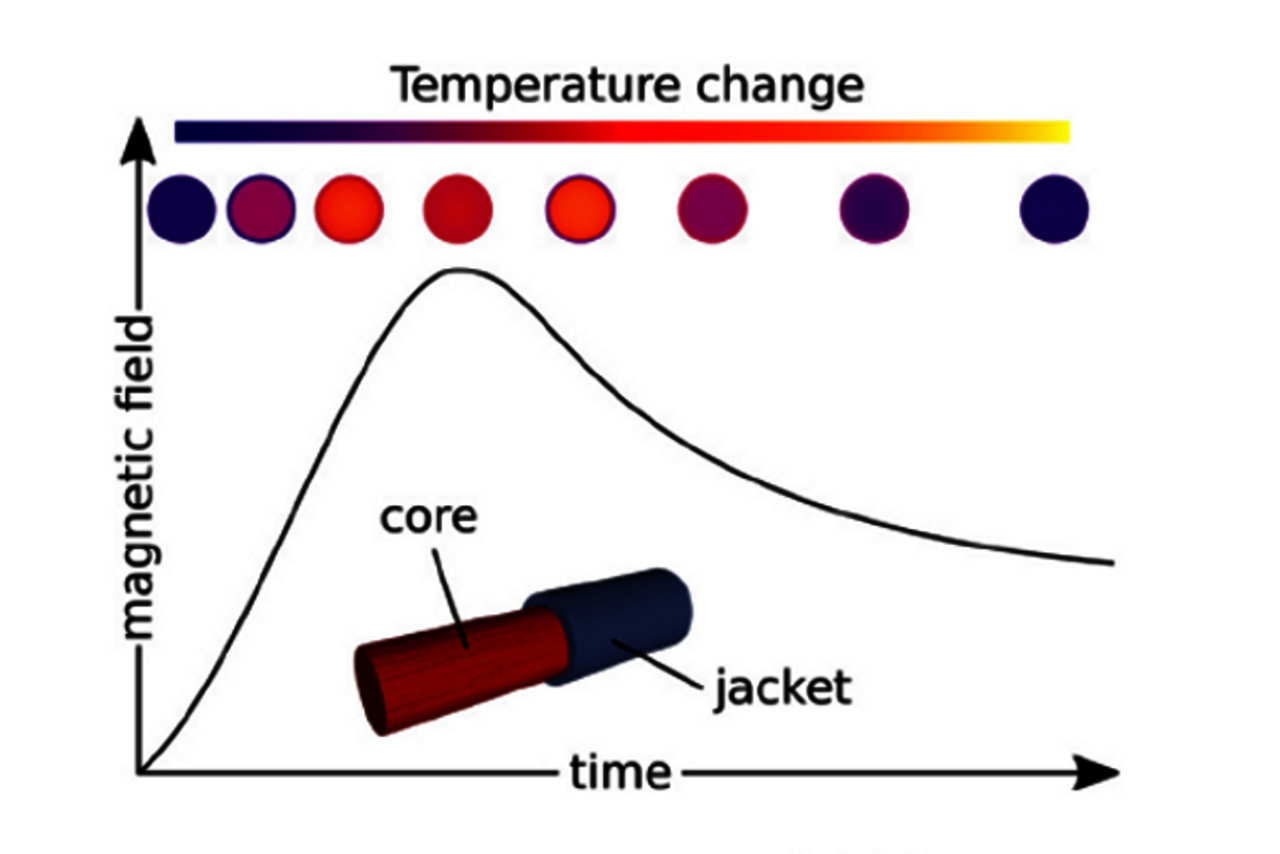 Magnetocaloric composite wires have been studied by pulsed-field measurements up to μ0ΔH = 10 T with a typical rise time of 13 ms in order to evaluate the evolution of the adiabatic temperature change of the core, ΔTad, and to determine the effective temperature change at the surrounding steel jacket, ΔTeff, during the field pulse. An inverse thermal hysteresis is observed for ΔTad due to the delayed thermal transfer. By numerical simulations of application-relevant sinusoidal magnetic field profiles, it can be stated that for field-frequencies of up to two field cycles per second heat can be efficiently transferred from the core to the outside of the jacket. In addition, intense numerical simulations of the temperature change of the core and jacket were performed by varying different parameters, such as frequency, heat capacity, thermal conductivity and interface resistance in order to hed light on their impact on ΔTeff at the outside of the jacket in comparison to ΔTad provided by the core.