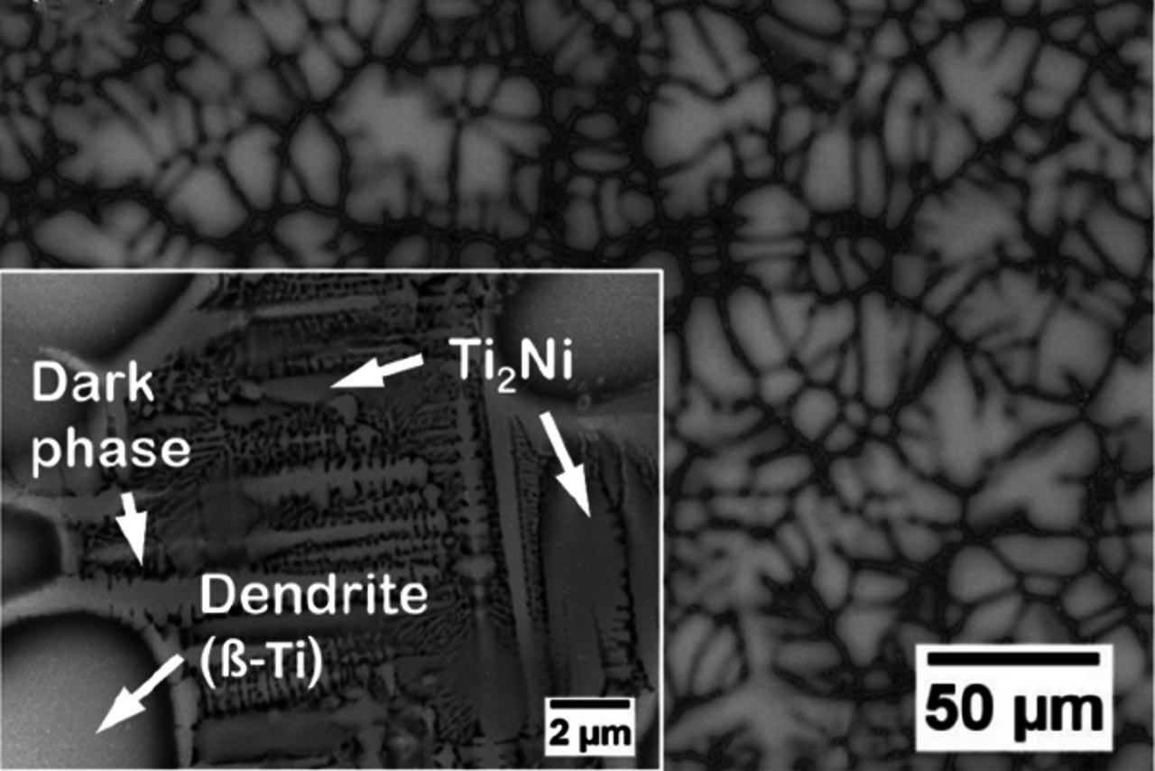 New as-cast Ti–V–Cu–Ni–Al alloys with advantageous modulus of resilience and bioperformance were developed. Their microstructure is composed of a dendritic β-Ti phase and in-situ precipitated interdendritic compounds. The tough and ductile β-Ti phase exhibits a relatively low Young's modulus. Ultrafine intermetallics effectively strengthen the alloys. The effect of microstructure on tensile plasticity was studied on strained (in-situ) and fractured (ex-situ) samples in the scanning electron microscope. It was found that the ductility depends on the volume fraction/distribution of the intermetallic phases as well as local segregation. Already in the as-cast state Ti68.8V13.6Cu6Ni5.1Al6.5 exhibits a tensile strength of about 1250 MPa and a ductility of about 4.5%.