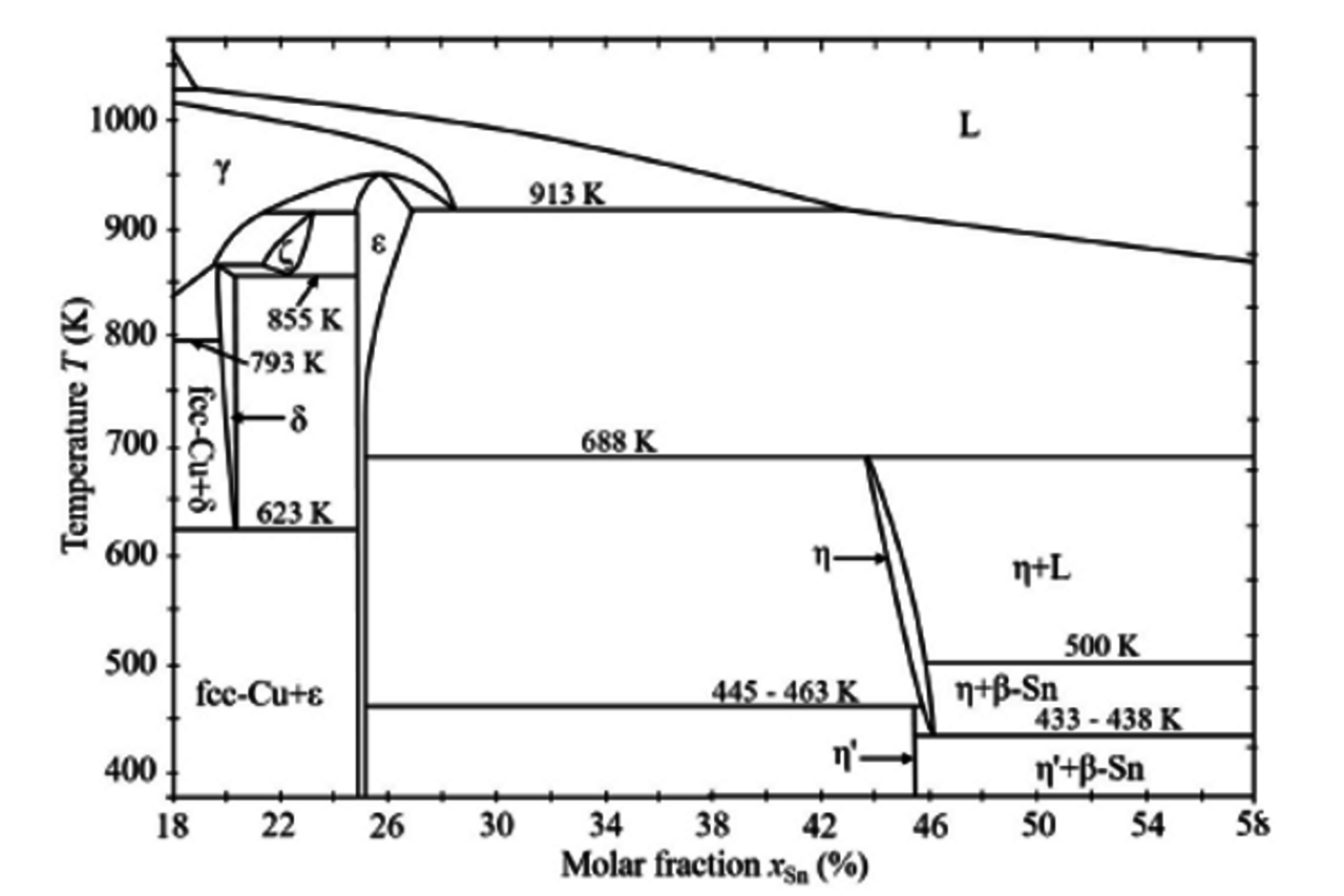 A current issue in electrical engineering is the enhancement of the quality of solder joints. This is mainly associated with the ongoing electrification of transportation as well as the miniaturization of (power) electronics. For the reliability of solder joints, intermetallic phases in the microstructure of the solder are of great importance. The formation of the intermetallic phases in the Cu-Sn solder system was investigated for different annealing temperatures between 472 K and 623 K using pure Cu as well as Cu-1at.%Ni and Cu-3at.%Ni substrate materials. These are relevant for lead frame materials in electronic components. The Cu and Cu-Ni alloys were in contact to galvanic plated Sn. This work is focused on the unexpected formation of the hexagonal f-(Cu,Ni)10Sn3 phase at annealing temperatures of 523–623 K, which is far below the eutectoid decomposition temperature of binary f-Cu10Sn3 of about 855 K. By using scanning electron microscopy, energy dispersive X-ray spectroscopy, electron backscatter diffraction and X-ray diffraction the presence of the f phase was confirmed and its structural properties were analyzed.