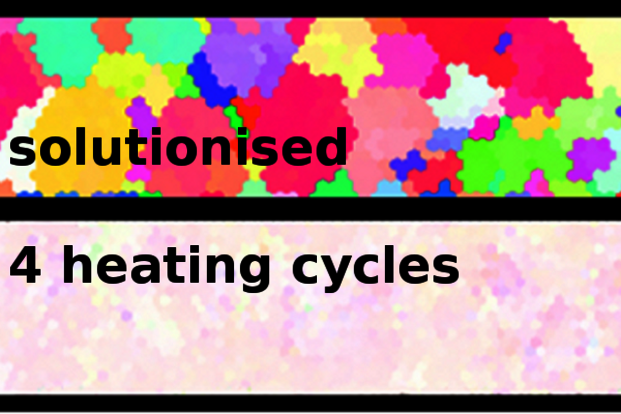 Dynamic recrystallisation of CuAgZr alloys within a composition range of (3–7) wt% Ag and (0.05–0.3) wt% Zr is studied as a function of alloy composition, temperature and strain. Dynamic recrystallisation was investigated using hot-compression and hot-rolling experiments at temperatures between 500 1C and 850 1C. For CuAgZr with 7 wt% Ag and 0.05 wt% Zr, an optimised hot-rolling temperature of 750 1C was found and a mean grain size of 25 μm was established at a true strain of 2.2. Similar grain size distributions were found for the extended range of alloy compositions while the active mechanism for changes from necklace towards a particle stimulated nucleation mechanism. This change is driven by the volume fraction of the ternary phase Cu4 AgZr as these particles are identified to stimulate nucleation of dynamic recrystallisation in the samples with increased Zr content. The final tapes exhibit an outstanding combination of ultimate tensile strength of 1 GPa and an electrical conductivity of 70%IACS at a true strain of 4.8 of cold work being applied.