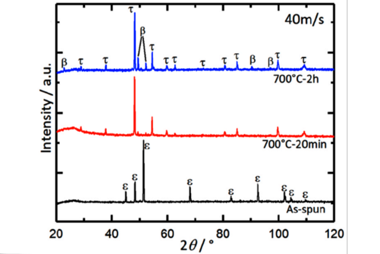 MnAl-C-Ni magnets with maximum energy products, (BH) max ≥ 42 kJ m −3 , were produced by hot extruding pulverised melt-spun ribbons. The small diameter of the columnar grains in the as-spun ribbons (1 µm ≤ d ≤ 6 µm), restricted the maximum size of the τ-phase grains, which formed during the holding process at 700 °C before the extrusion. The absence of non-recrystallised regions in the extruded material made from ribbons produced at high wheel speed was attributed to this smaller initial τ-phase grain size (1 µm ≤ d ≤ 2 µm) and resulted in an enhancement of the squareness factor of the demagnetisation curve.