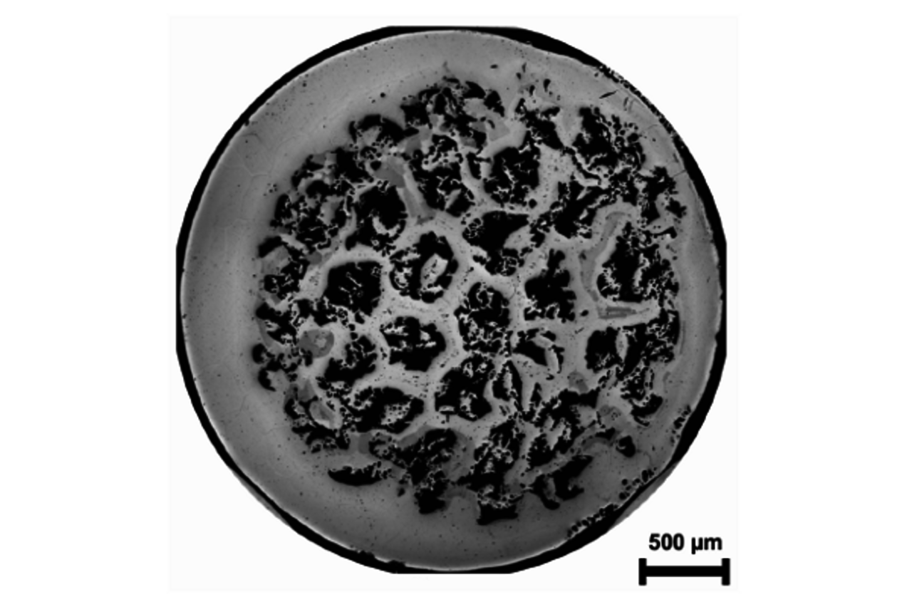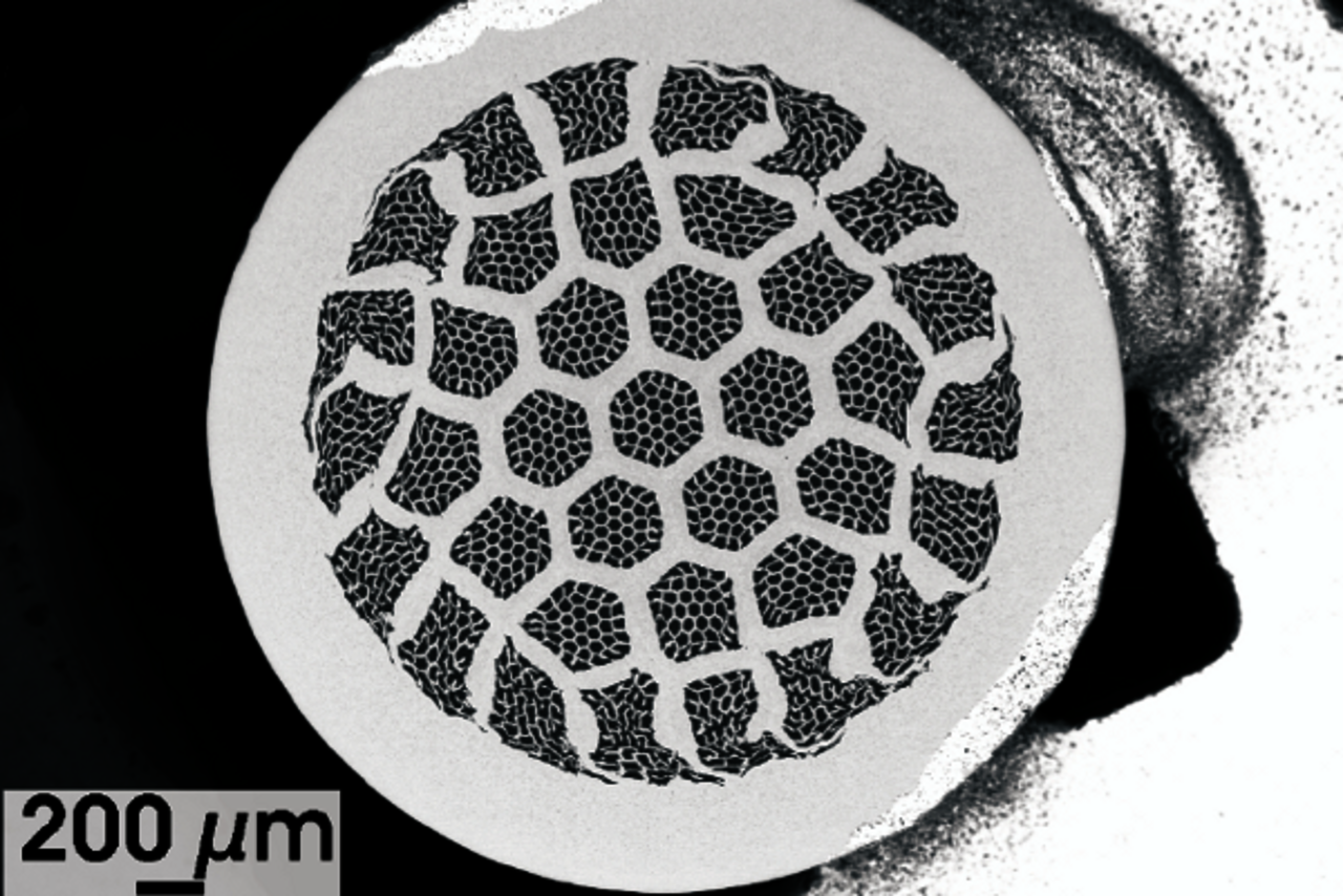 An alternative deformation technique was applied to a composite made of titanium and an aluminium alloy in order to achieve severe plastic deformation. This involves accumulative swaging and bundling. Furthermore, it allows uniform deformation of a composite material while producing a wire which can be further used easily. Detailed analysis concerning the control of the deformation process, mesostructural and microstructural features and tensile testing was carried out on the as produced wires. A strong grain refinement to a grain size of 250–500 nm accompanied by a decrease in 111 fibre texture component and a change from low angle to high angle grain boundary characteristics is observed in the Al alloy. A strong increase in the mechanical properties in terms of ultimate tensile strength ranging from 600 to 930 MPa being equivalent to a specific strength of up to 223 MPa/(g/cm3) was achieved.