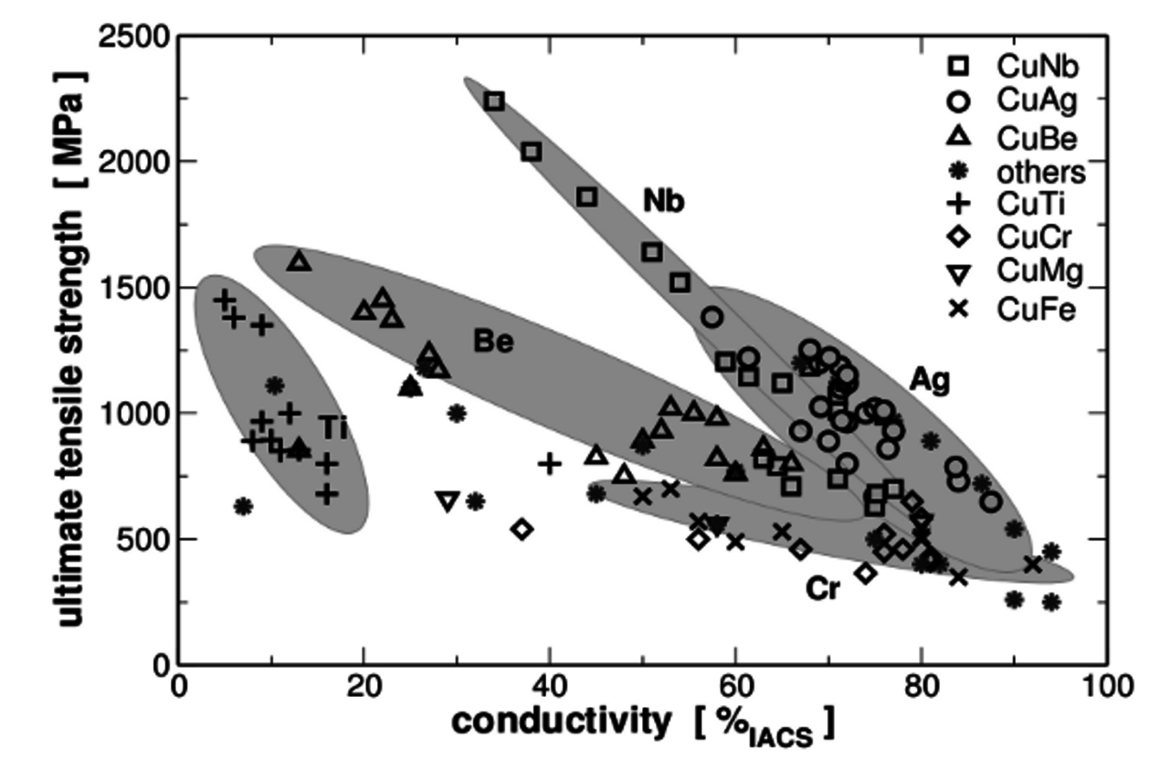 Materials with apparently conflictive combination of materials properties, such as high conductivity and strength are facing growing interest. Their availability is claimed in a wide scope of application. On the one hand there are micro-electromechanical units in which the energy absorption, which is caused by mechanical loading, has to be raised beyond the present limits. Thus, the efficiency can be increased, while the power durability is warranted even at high energy. On the other (macroscopic) side highly strengthened conductors with a good formability are required as e.g. for the windings in non-destructive high field magnets which are operated in a pulsed mode. The mechanical and physical properties of the conductors is strongly related to their microstructure. Thus, the control of the microstructure is a crucial item when adjusting an optimised combination of materials properties. Due to its high thermal and electrical conductivity Copper is the ideal candidate to form alloys and materials that serve as conductor. Alloying bears the potential to apply several hardening mechanisms to enhance the strength. A special interest is paid to the increase of the strength due to the formation of precipitates. In contrast to dispersion strengthened materials they face a higher strengthening potential. However, they are less thermal stable and their potential can be used at low temperatures, only. Nevertheless, if the temperature of the conductor can be kept at or below room temperature these conductors are highly recommended to be used. The possibility to adjust the microstructure by thermal and mechanical treatments builds the basis to develop highly strengthened conductor materials, which materials properties have to be fitted to the case of applications within a broad range of application. This article reviews the properties of age hardenable, highly strengthened Copper based conductor materials that are developed for applications at room temperature and below.