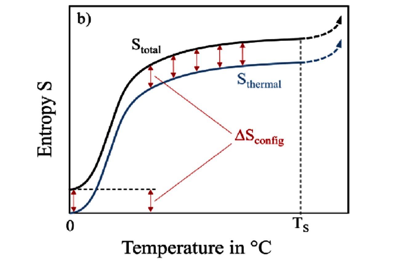 We determined the entropy of high entropy alloys by investigating single-crystalline nickel and five high entropy alloys: two fcc-alloys, two bcc-alloys and one hcp-alloy. Since the configurational entropy of these single-phase alloys differs from alloys using a base element, it is important to quantify the entropy. Using differential scanning calorimetry, cp -measurements are carried out from −170°C to the materials’ solidus temperatures TS . From these experiments, we determined the thermal entropy and compared it to the configurational entropy for each of the studied alloys. We applied the rule of mixture to predict molar heat capacities of the alloys at room temperature, which were in good agreement with the Dulong-Petit law. The molar heat capacity of the studied alloys was about three times the universal gas constant, hence the thermal entropy was the major contribution to total entropy. The configurational entropy, due to the chemical composition and number of components, contributes less on the absolute scale. Thermal entropy has approximately equal values for all alloys tested by DSC, while the crystal structure shows a small effect in their order. Finally, the contributions of entropy and enthalpy to the Gibbs free energy was calculated and examined and it was found that the stabilization of the solid solution phase in high entropy alloys was mostly caused by increased configurational entropy.
