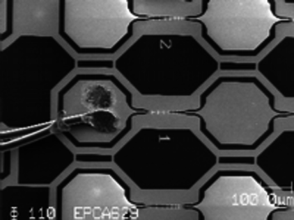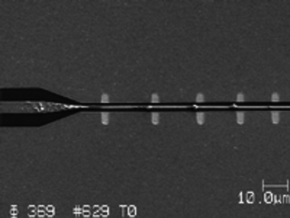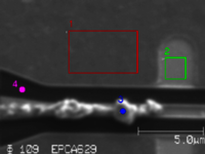 The secondary electron images show - from left to right – zooming to the position of the analysis areas in the test structure.