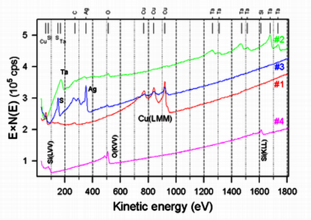 The spectra are shown in their true intensity ratios. Prominent Auger peaks are labeled. The different background corresponds to the brightness in the secondary electron image and reflects the decreasing atomic number of the analyzed material from heavy Ta (#2) over Ag (#3), Cu (#1) to Si oxide (#4).