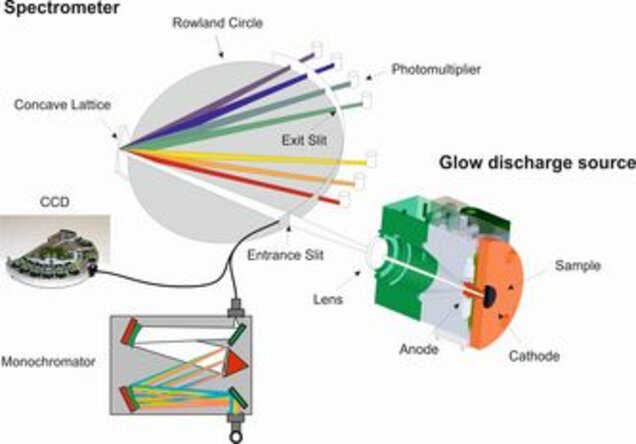 In a glow discharge spectrometer sample atoms are sputtered continuously or in pulsed mode and then transferred into the plasma. The following analysis of the emitted light of the plasma is used for the depth resolved analysis of the chemical composition of the sample.