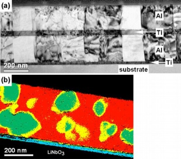 The effects ofheat treatment on the microstructure of Al/Ti metallization multilayers were studied by electron spectroscopic imaging (ESI) in the transmission electron microscope (TEM). The multilayers were deposited on a suite of piezoelectric substrate materials (Quartz, LiTaO3, and LiNbO3) by electron beam evaporation. In the as-deposited state, we did not detect a reaction between the individual Al and Ti layers (Fig. 1(a)). However, after annealing in air at 450 °C for five hours, we found the intermediate Ti layer completely dissolved. In the course of this reaction, the microstructure of the layers transforms from rectangular to globular grains consisting of the intermetallic phase Al3Ti within an Al matrix.