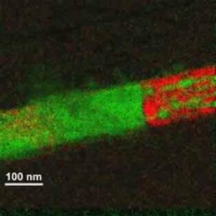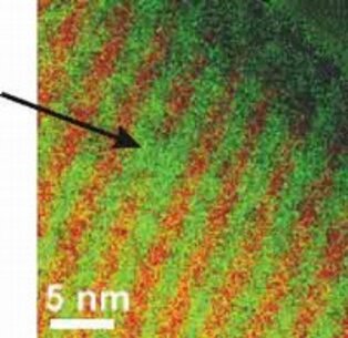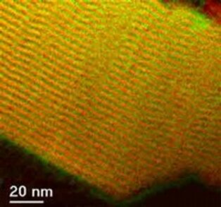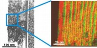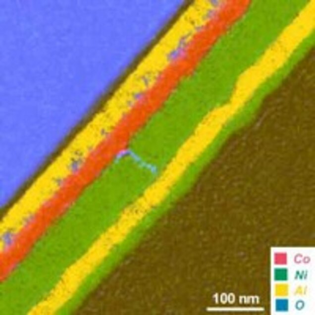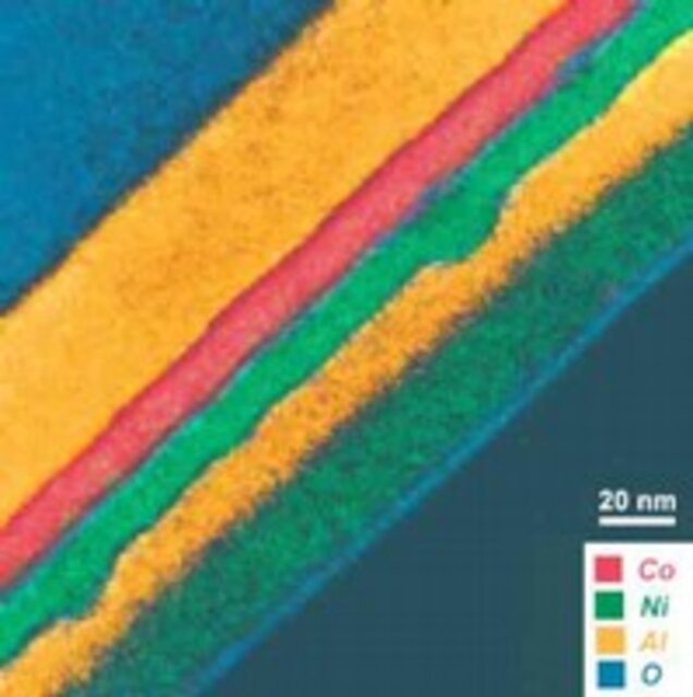 Structural clarification of GMR changes at high temperatures by use of Energy Filtered Transmission Electron Microscopy (EFTEM). This allows color coded maps of the elemental distribution. Here we chose red for Co and green for Cu. The individual layers have 2nm thickness. Research in collaboration with dept. Thin films and nanostructures.
