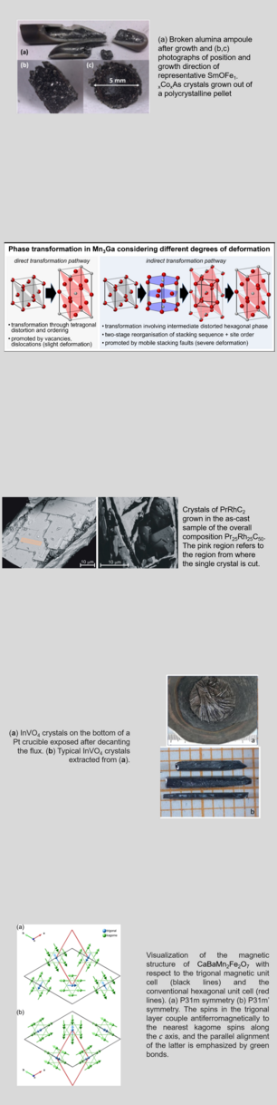 The development or modification of growth methods may be necessary to synthesize materials with targeted properties in poly- or single-crystalline form. We explore the driving forces for a certain phenomenon and/or functionality by probing the structure-property relationships also in cooperation with partners.