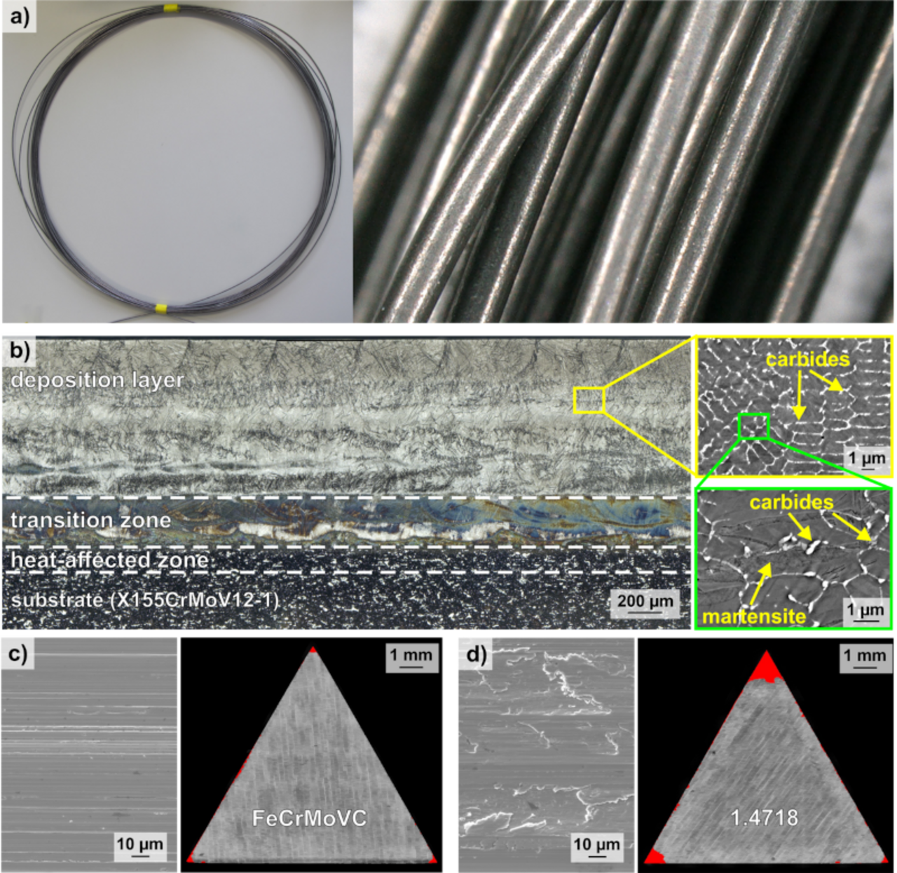 The research activities focus on the development of novel tailored steels applicable as filler materials for hardfacing and repair welding of high-performance tool steels, which can be processed as wire or powder material by e.g. manual laser cladding or directed energy deposition (DED).