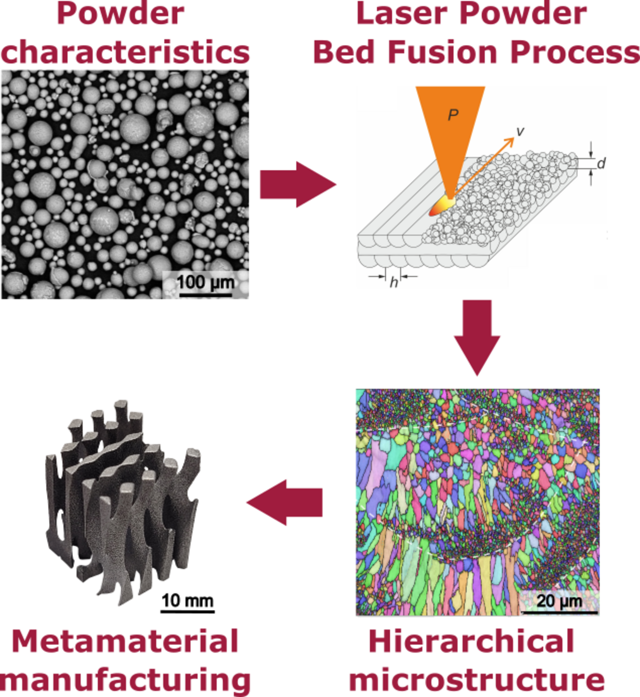 In addition, rare-earth free Al-Mg-Zr-based alloys for robust processing of resilient and damage-tolerant materials by PBF-LB/M are being developed. The alloy design is supported by data-driven and experimental methods to accelerate the materials discovery. This is accompanied by cross-scale characterization in order to analyze the influence of the microstructure on the mechanical properties. By this approach, new Al-Mg-Zr-Si alloys have been developed, which can be used to manufacture resilient structures such as artificially designed mechanical metamaterials (see Fig. 2).