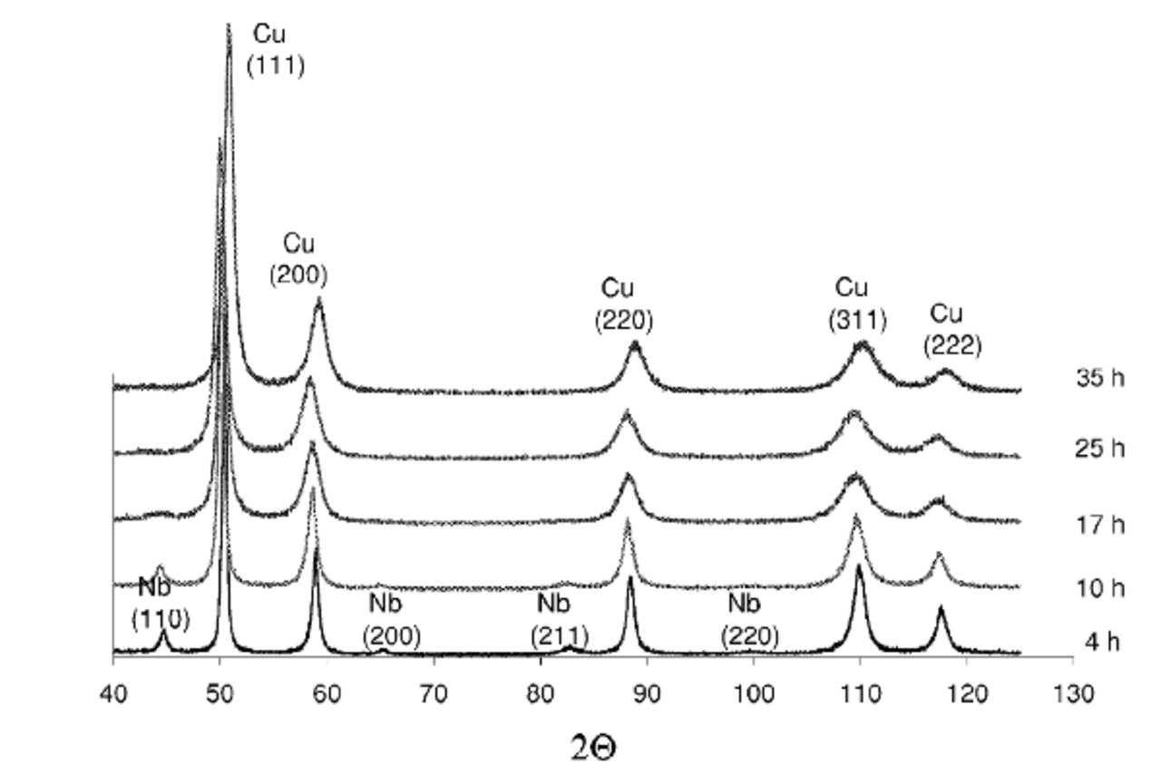 Alloys with both high strength and high conductivity have been produced by mechanical alloying. In the present study, copper was mechanically alloyed with 5, 10 and 20 at.% Nb using a planetary ball mill. The Cu–Nb phase diagram shows a negligibly low mutual solubility in the solid state, but high energy ball milling can largely extend the region of solid state solution. Previously, it was observed that niobium partly dissolves in the copper lattice during milling. The present investigation demonstrates that this limit can be extended to a strongly supersaturated Cu solid solution of up to 10 at.% Nb provided the appropriate mechanical alloying method is applied. The change in the powder microstructure was followed by scanning and transmission electron microscopy (TEM) as well as by X-ray diffraction (XRD) analysis. In the case of Cu–5%Nb and Cu–10%Nb a homogeneous single-phase microstructure was obtained after 30 h of milling. Elemental Nb could no more be detected, indicating the formation of a metastable supersaturated Cu–Nb solid solution.