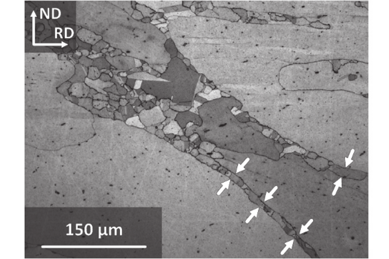 Dynamic recrystallisation of CuAgZr alloys within a composition range of (3–7) wt% Ag and (0.05–0.3) wt% Zr is studied as a function of alloy composition, temperature and strain. Dynamic recrystallisation was  investigated using hot-compression and hot-rolling experiments at temperatures between 500 1C and  850 1C. For CuAgZr with 7 wt% Ag and 0.05 wt% Zr, an optimised hot-rolling temperature of 750 1C was found and a mean grain size of 25 μm was established at a true strain of 2.2. Similar grain size distributions were found for the extended range of alloy compositions while the active mechanism for changes from necklace towards a particle stimulated nucleation mechanism. This change is driven by the volume fraction of the ternary phase Cu4 AgZr as these particles are identified to stimulate nucleation of dynamic recrystallisation in the samples with increased Zr content. The final tapes exhibit an outstanding combination of ultimate tensile strength of 1 GPa and an electrical conductivity of 70%IACS at a true strain of 4.8 of cold work being applied.