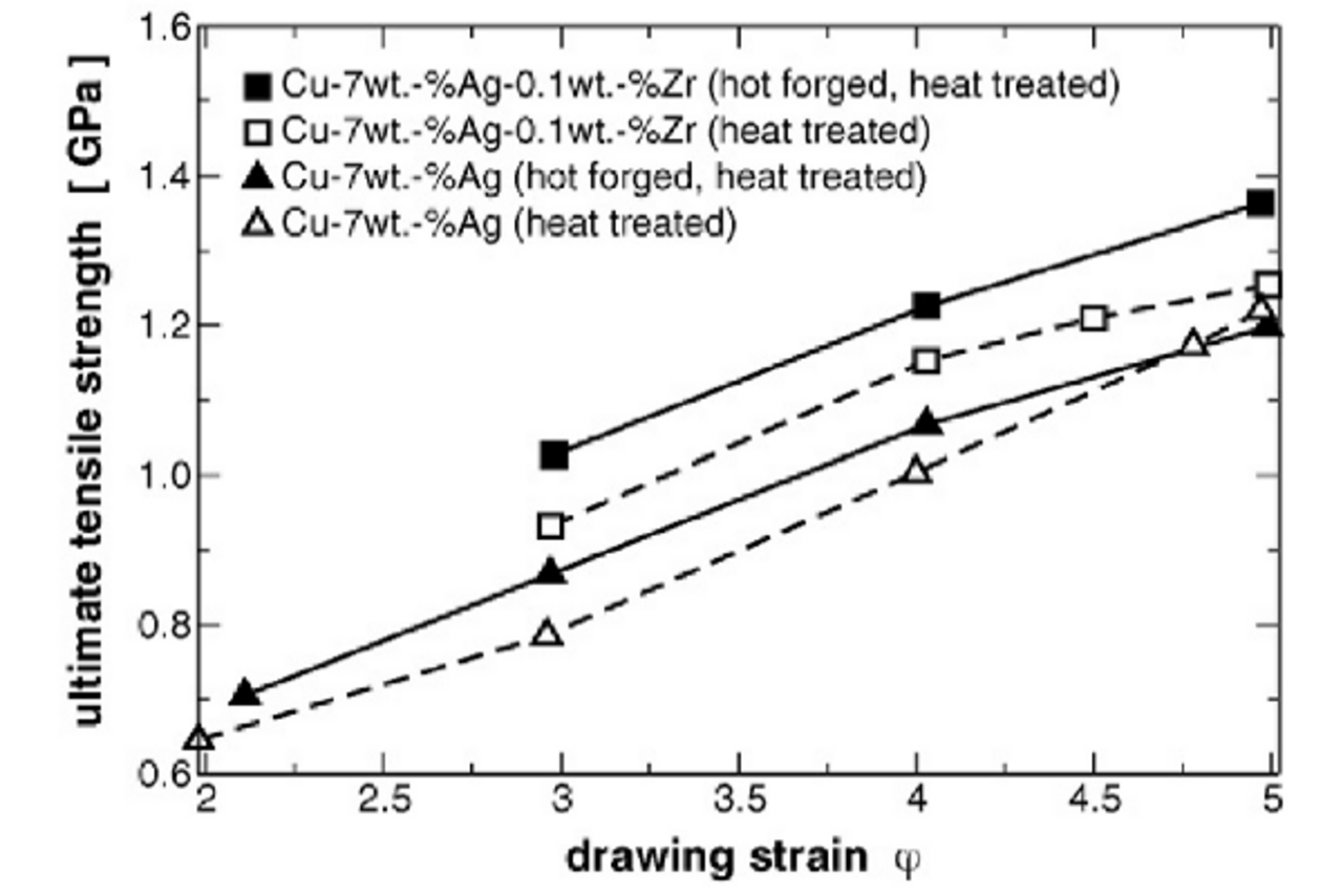 Adding up to 0.05 wt.%Zr to Cu–7 wt.%Ag alloys suppresses the discontinuous precipitation mode in these alloys. As a consequence, the continuous precipitation mode, which is also commonly observed in these alloys, is enhanced. The addition of Zr in the mentioned range guarantees a minimum of secondary phases that contain Zr. The subjection of Cu–7 wt.%Ag–0.05 wt.%Zr alloys to a certain deformation strain followed by an intermediate heat treatment gives rise to a logarithmic drawing strain of up to φ = 5.82 in these alloys. In this cold worked condition, an ultimate tensile strength of 1.4 GPa and a strain to failure of 1.6% are observed. Furthermore, an electrical conductivity of 60%IACS (IACS, International Annealed Copper Standard, i.e. the conductivity of copper) is measured. The influence of the Zr content, the thermal treatments, and the  deformation process on the microstructure and thereby on the mechanical and electrical properties is discussed.