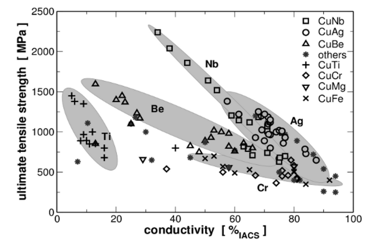 Materials with apparently conflictive combination of materials properties, such as high conductivity and strength are facing growing interest. Their availability is claimed in a wide scope of application. On the one hand there are micro-electromechanical units in which the energy absorption, which is caused by mechanical loading, has to be raised beyond the present limits. Thus, the efficiency can be increased, while the power durability is warranted even at high energy. On the other (macroscopic) side highly strengthened conductors with a good formability are required as e.g. for the windings in non-destructive high field magnets which are operated in a pulsed mode. The mechanical and physical properties of the conductors is strongly related to their microstructure. Thus, the control of the microstructure is a crucial item when adjusting an optimised combination of materials properties. Due to its high thermal and electrical conductivity Copper is the ideal candidate to form alloys and materials that serve as conductor. Alloying bears the potential to apply several hardening mechanisms to enhance the strength. A special interest is paid to the increase of the strength due to the formation of precipitates. In contrast to dispersion strengthened materials they face a higher strengthening potential. However, they are less thermal stable and their potential can be used at low temperatures, only. Nevertheless, if the temperature of the conductor can be kept at or below room temperature these conductors are highly recommended to be used. The possibility to adjust the microstructure by thermal and mechanical treatments builds the basis to develop highly strengthened conductor materials, which materials properties have to be fitted to the case of applications within a broad range of application. This article reviews the properties of age hardenable, highly strengthened Copper based conductor materials that are developed for applications at room temperature and below.