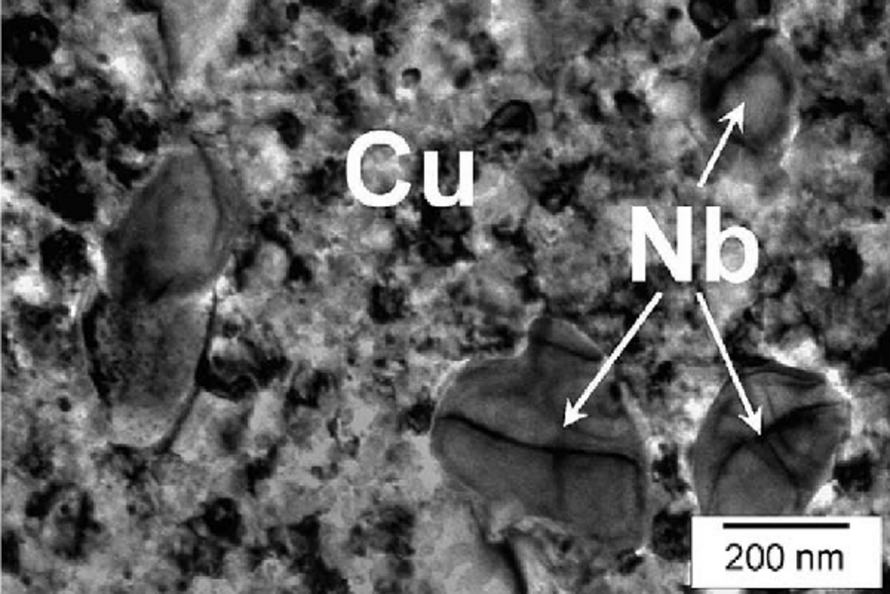 Nanocrystalline Cu and Cu–Nb alloys were prepared by the consolidation of mechanically alloyed powder. The alloys show a microstructure with a grain size below 50 nm. The microstructure of the Cu matrix remains stable even at elevated temperatures of up to 900 °C, whereas the Nb precipitates coarsen during annealing. The mechanical strength as well as the electrical conductivity depend on the grain size of the Cu matrix, which can be influenced by the temperature of the heat treatment, i.e., a mechanical strength of about 1.6 GPa is measured for a Cu–10 at.% Nb alloy which shows an electrical conductivity of about 10% IACS (international annealing copper standard) at room temperature. The main contribution to the mechanical strength of the alloys is attributed to the grain boundary strengthening in Cu referring to the Hall–Petch relation, which is quantified. The grain boundaries are also found to influence considerably the electrical resistivity.
