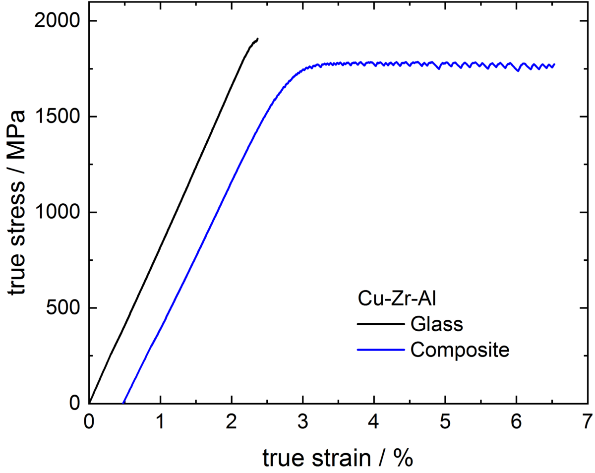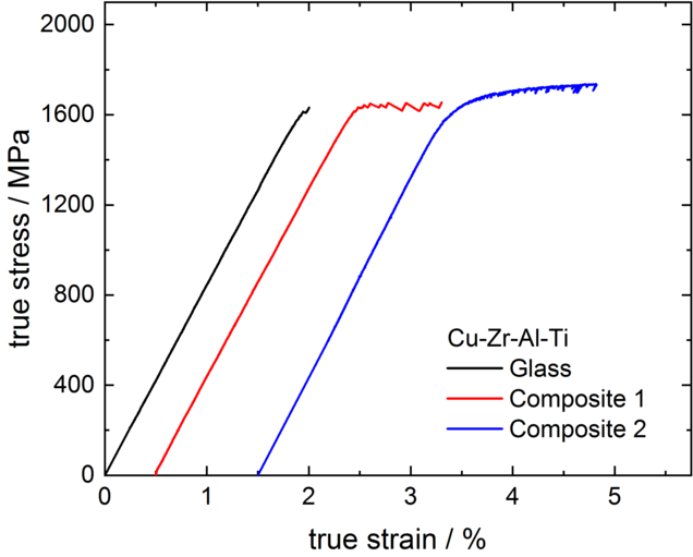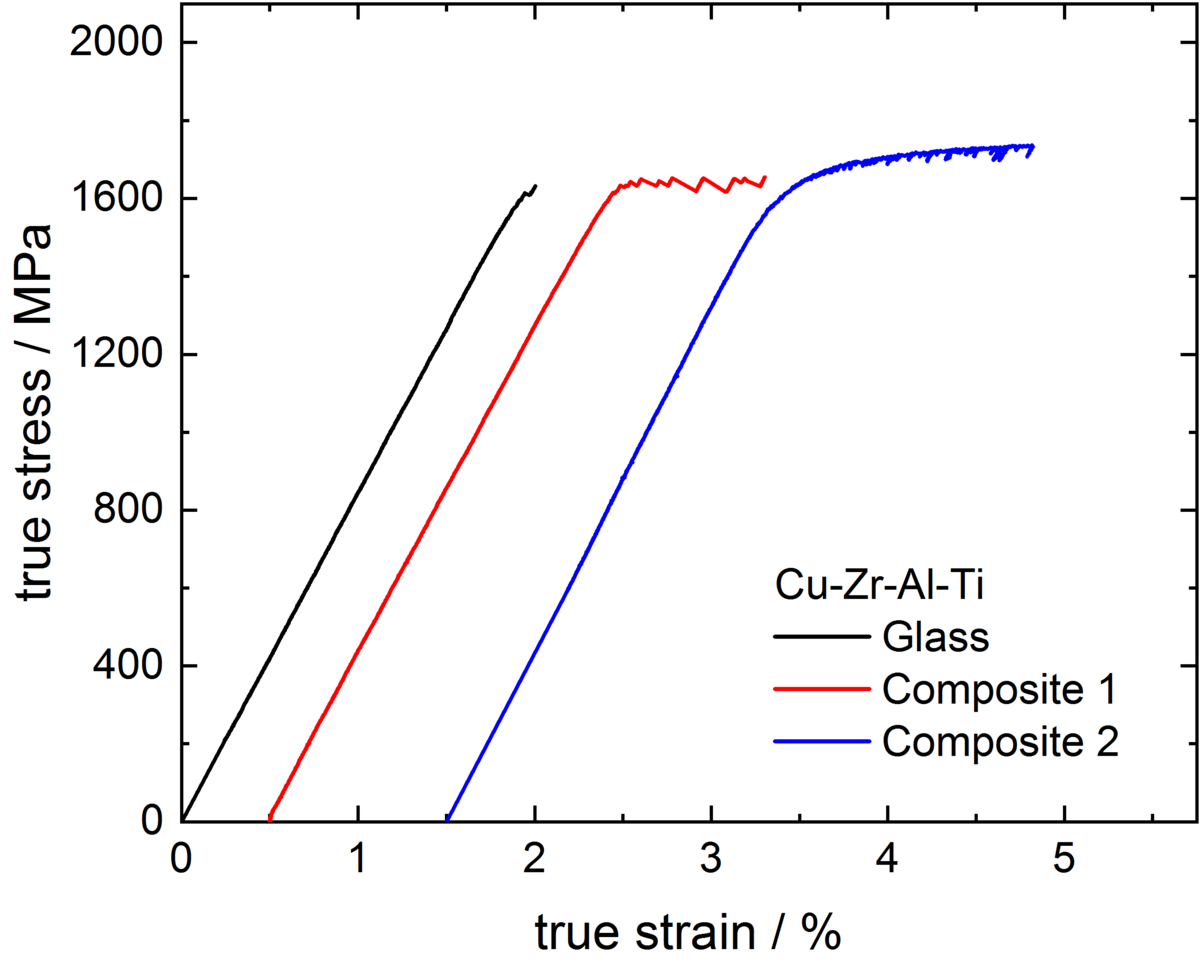 Properties desired for industrial applications are toughness, ductility, and work-hardening ability and should be achieved by the formation of crystalline precipitates, so-called BMG matrix composites. During deformation, the crystalline particles can effectively inhibit the rapid propagation of shear bands by changing the actual stress distribution in the glassy matrix and thus enhance the ductility of the composite at room temperature. Thereby the deformation behaviour strongly depends on the distribution, the size, and the volume fraction of the crystalline particles in the glassy matrix.