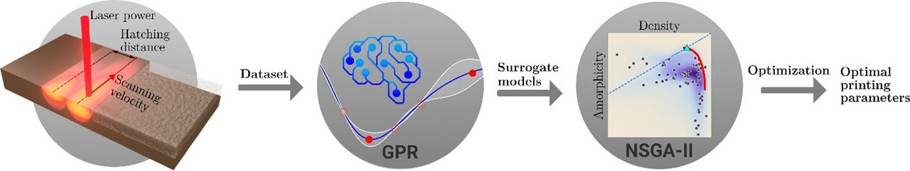 (1) Bayesian optimization (BO) frameworks for modelling process–structure–property relationships: Using BO to efficiently predict optimal LPBF parameters for the successful fabrication of high-density components from industrially relevant, but difficult to process alloys. BO is designed for accurately predicting optimal conditions despite the limited data and for multi-objective scenarios, thereby enabling digital materials design.